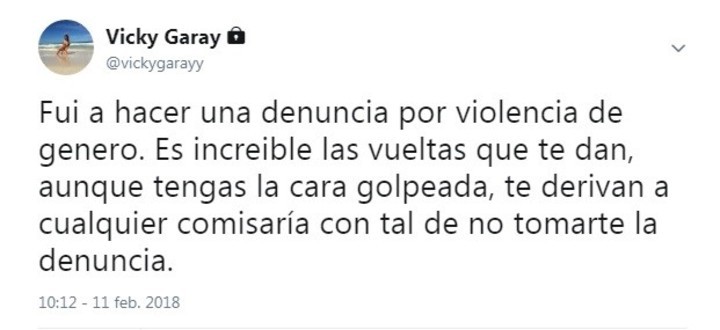 “Fui a hacer una denuncia por violencia de género. Es increíble las vueltas que te dan, aunque tengas la cara golpeada, te derivan a cualquier comisaría con tal de no tomarte la denuncia”, escribió.
