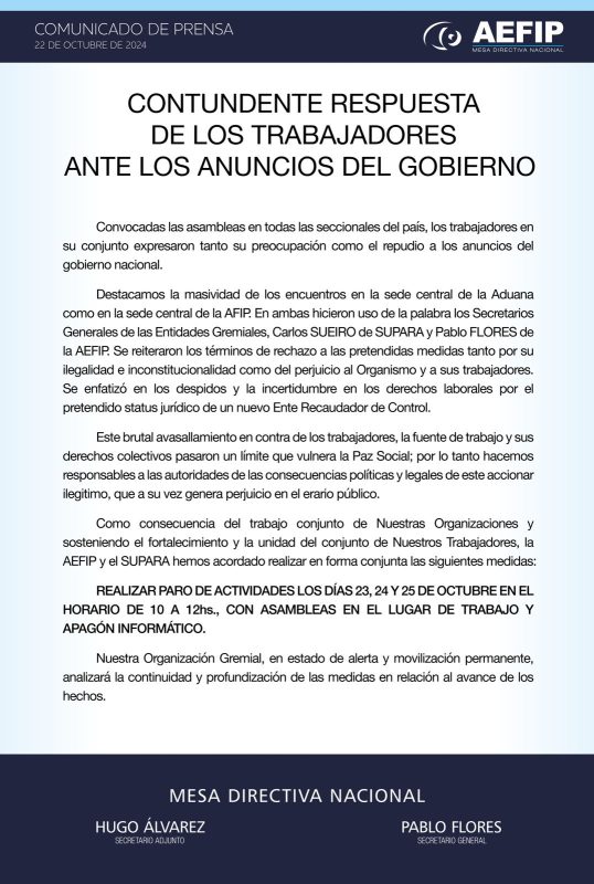 Desde la Asociación de Empleados Fiscales y de Ingresos Públicos (AEFIP), el segundo gremio del organismo -el tercero es el de los jerárquicos- adhieren a la medida.
