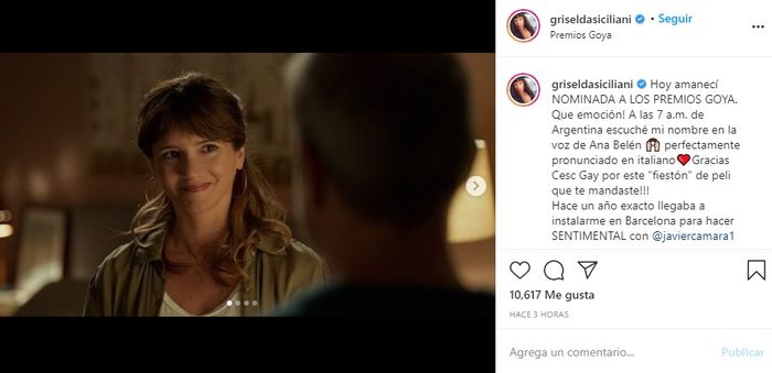 “Hoy amanecí NOMINADA A LOS PREMIOS GOYA. Que emoción! A las 7 a.m. de Argentina escuché mi nombre en la voz de Ana Belén perfectamente pronunciado en italiano. Gracias Cesc Gay por este “fiestón” de peli que te mandaste!!! Hace un año exacto llegaba a instalarme en Barcelona para hacer SENTIMENTAL con @javiercamara1 @belen_cue y #AlbertoSanJuan Y ya trabajar con ellos me parecía un premio, los amo amigos queridos…“, indicó feliz la actriz en Instagram.