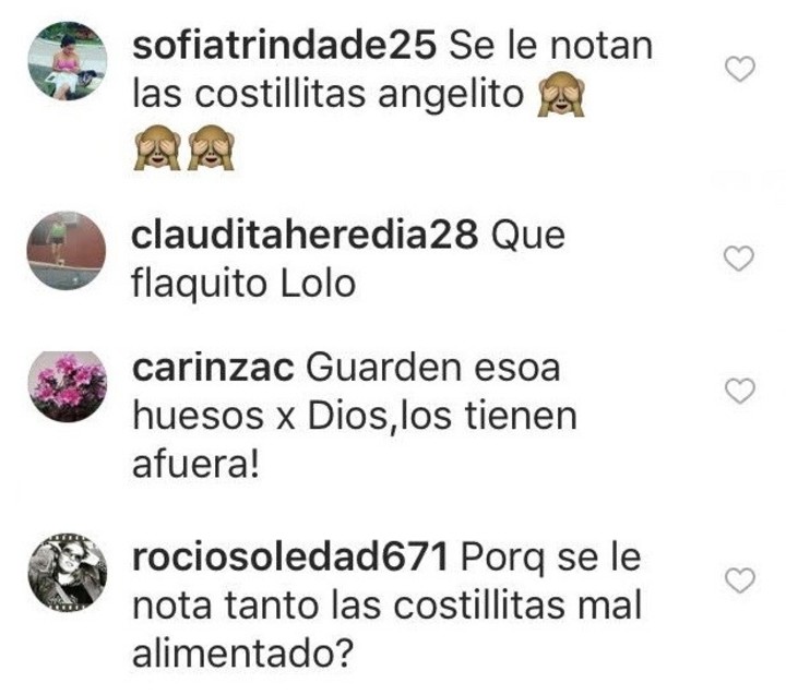Guarden esos huesos por Dios, los tienen afuera“, y “¿Por qué se le notan tanto las costillas, mal alimentado?“, agregaron otras seguidoras de la también madre de Dante, Paloma, y Helena, hijos del productor Sebastián Ortega.