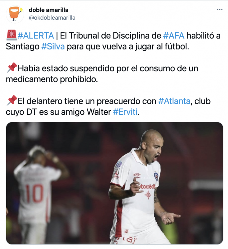 “🚨#ALERTA | El Tribunal de Disciplina de #AFA habilitó a Santiago #Silva para que vuelva a jugar al fútbol. 📌Había estado suspendido por el consumo de un medicamento prohibido. 📌El delantero tiene un preacuerdo con #Atlanta, club cuyo DT es su amigo Walter #Erviti”, expresó en Twitter el medio Doble Amarilla.