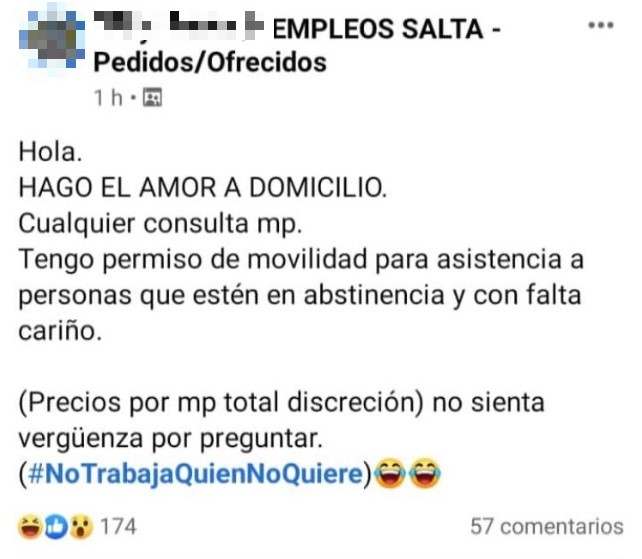 En medio de la cuarentena por el coronavirus, se generó una crisis económica en varios sectores que promovió a muchas personas a buscar una nueva salida laboral. Un joven salteño fue más allá de eso y publicó un insólito anuncio en una página de empleos: “Hago el amor a domicilio”.
