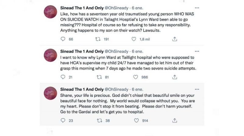 La artista publicó varios mensajes para que su hijo pudiera leerlos y reflexionar sobre lo que se encontraba haciendo: “Shane, tu vida es preciosa. Dios no esculpió esa hermosa sonrisa en tu hermoso rostro por nada. Mi mundo colapsaría sin ti. Tú eres mi corazón. Por favor, no dejes de latir. Por favor, no se haga daño. Ve al Gardai y te llevaremos al hospital. Sinead el 1 y único @OhSineady (…) Este es un mensaje para mi hijo, Shane. Shane, ya no es gracioso esta desaparición. Me estás asustando muchísimo. ¿Podrías hacer lo correcto y presentarse en una estación de Gardai? Si está con Shane, llame al Gardai por su seguridad“. (Exitoina)