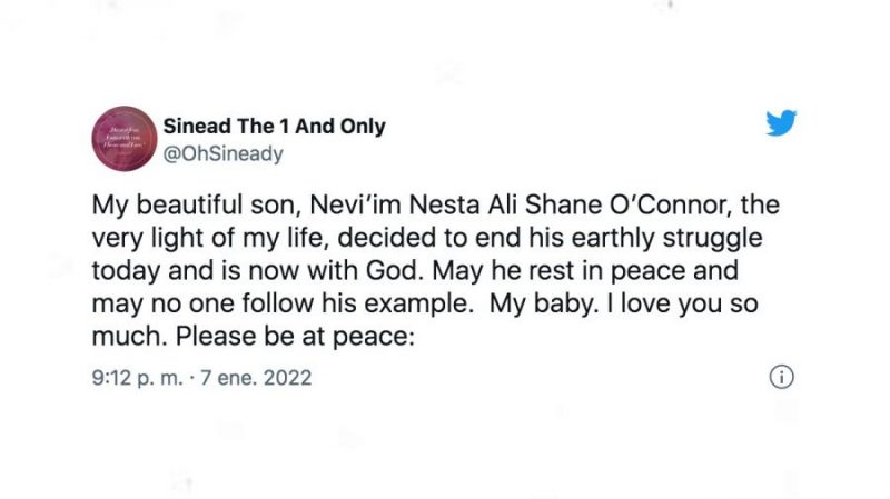 La artista escribió en su cuenta de Twitter: “Mi hermoso hijo, Nevi’im Nesta Ali Shane O’Connor, la luz misma de mi vida, decidió poner fin a su lucha terrenal hoy y ahora está con Dios. Que descanse en paz y que nadie siga su ejemplo. Mi bebé. Te amo tanto“. Una hora después de publicar el triste tuit, Sinéad O’Connor acudió nuevamente a su perfil para dedicarle a su hijo una parte de la canción de Bob Marley llamada “Ride natty ride”: “Esto es para mi Shaney. La luz de mi vida. La lámpara de mi alma. Mi bebé de ojos azules. Siempre serás mi luz. Siempre estaremos juntos. Ningún límite puede separarnos“.