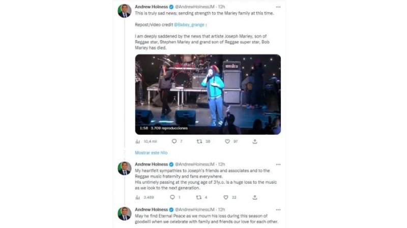 El primer ministro de Jamaica, Andrew Holness, escribió en sus redes sociales que estaba “profundamente entristecido” por la noticia de la muerte y ofreció sus condolencias a los padres de Marley, Stephen y Kerry.