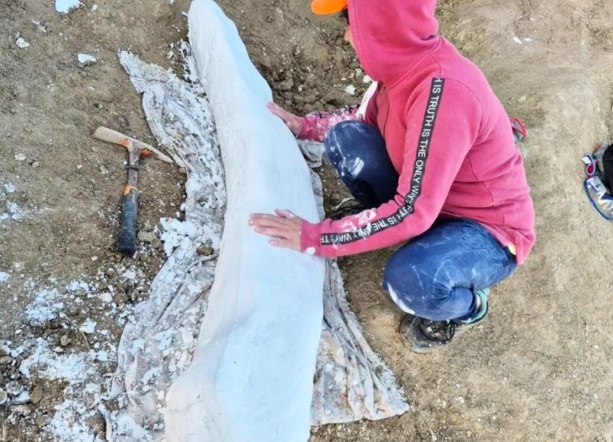 Según informó la institución, la pieza —una defensa fosilizada de más de un metro y medio de longitud con leve curvatura— fue encontrada en las cercanías de Centinela del Mar, a unos 50 kilómetros al sur de Miramar, en sedimentos con una antigüedad superior a los 100.000 años, dentro de una reserva natural recientemente creada.