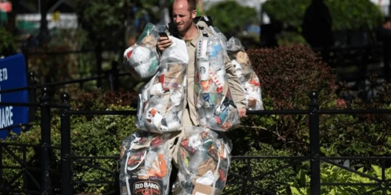 El estadounidense Rob Greenfield (33), conocido como “trash man” o “el hombre basura”, en 2016 decidió vestirse con sus propios desechos y caminar así por las calles de Nueva York. Dos años después informó que durante doce meses no se alimentaría de nada que le costara dinero, y el año se cumplirá este domingo 10 de noviembre.