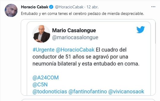 Al leer el tweet, Cabak respondió enojadísimo: “Entubado y en coma tenés el cerebro pedazo de mier… despreciable“.