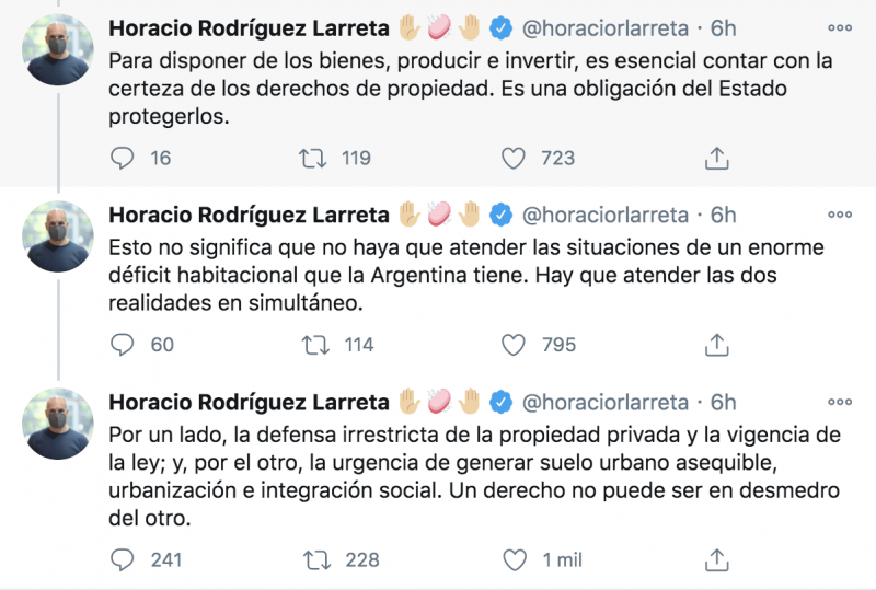 “Y, como marca la Constitución en su artículo 17, la propiedad es inviolable y solo una sentencia fundada en ley puede privar a alguien del derecho a la misma. Para disponer de los bienes, producir e invertir, es esencial contar con la certeza de los derechos de propiedad. Es una obligación del Estado protegerlos“, reclamó Horacio Rodríguez Larreta desde su cuenta de Twitter.