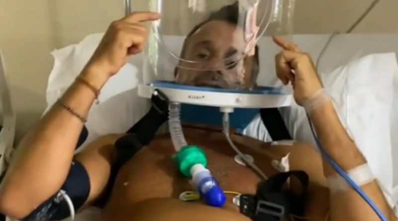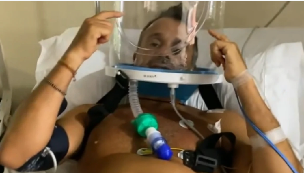En cuero y con un casco para ventilación no invasiva, Sergio Lapegüe grabó un impactante video en el que habló de su estado de salud mientras sigue internado en terapia intensiva por contagiarse el coronavirus Covid-19.