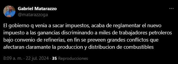 Al respecto, el secretario general del Sindicato de Petróleo Gas y Biocombustibles de Bahía Blanca, Gabriel Matarazzo, señaló que “el gobierno que venía a sacar impuestos acaba de reglamentar el nuevo impuesto a las ganancias”.