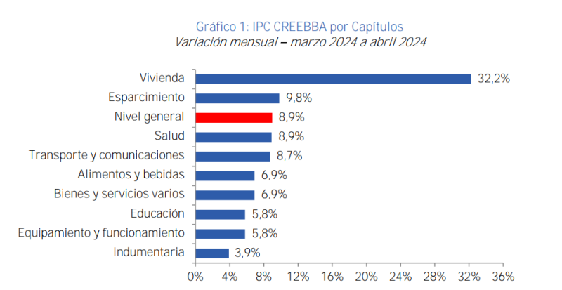 Durante el mes de abril, en Bahía Blanca, el mayor aumento a nivel capítulos fue en Vivienda, el cual registró un crecimiento del 32,2% como consecuencia de variaciones en electricidad (72,5%) debido al efecto arrastre del mes anterior, servicios sanitarios, gas y otros combustibles (54,0%), alquiler de la vivienda (14,9%), y materiales y mano de obra (5,9%).