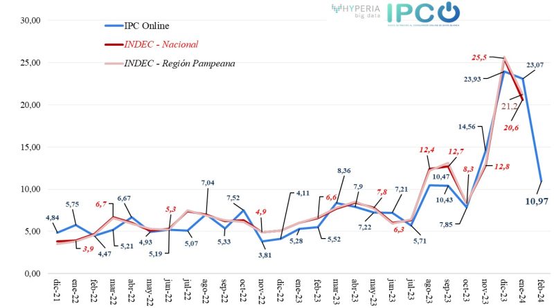 La inflación de febrero en Bahía Blanca fue de 10,97%, informó el IPC On Line.