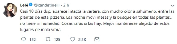 Ahora la cartera apareció y ella salió a contar dónde la encontraron. “Casi 10 días después, aparece intacta la cartera, con mucho olor a sahumerio y entre las plantas de esta pizzería. Esa noche moví mesas y la busqué en todas las plantas. No tiene ni humedad. Cosas raras si las hay. Mejor mantenerse alejado de estos lugares de mala vibra”, publicó la hija de marcelo en su red social.