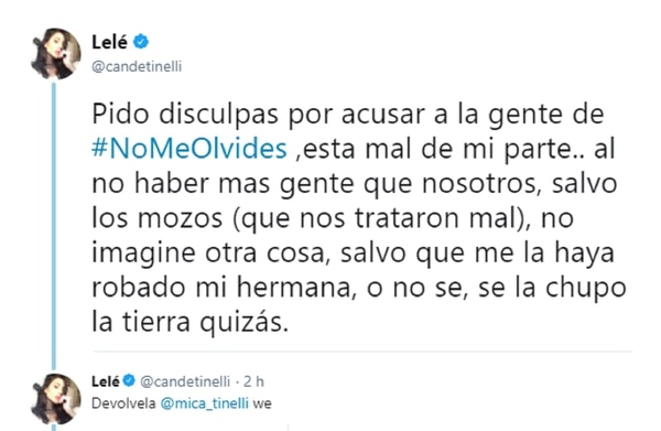 Después de que uno de los empleados del lugar le enviara un mensaje pidiendo que no los acuse sin pruebas, la it girl bromeó diciendo que capaz a su accesorio le salieron “patitas” y se fue caminando, o bien se la robó su hermana, Micaela.
