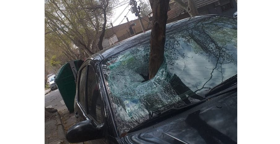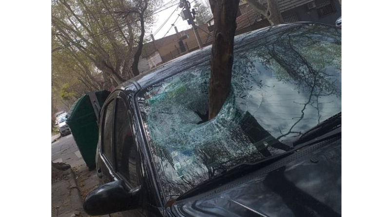 A raíz del intenso viento que azotó a Rosario y la zona aledaña, una rama de grandes dimensiones se desprendió de un árbol y se incrustó en el parabrisas de un auto estacionado en Riobamba y Suipacha, en el Parque Independencia.