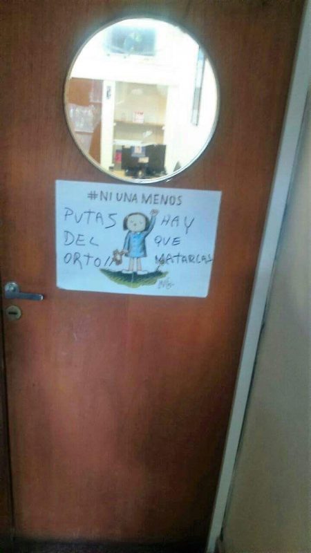 En la facultad de Exactas de la UNLP (La Plata) expresaron una “profunda preocupación” por la “grave amenaza que un desconocido escribió sobre un cartel de Ni una Menos” ubicado en la secretaría de Coordinación de Gestión: “Putas del orto, hay que matarlas”. La cámara de seguridad captó la imagen del responsable y las autoridades la subieron al Facebook de la unidad académica, al tiempo que iniciaron una investigación formal.