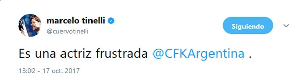 Este martes visitó el programa que conduce Gerardo Rozín en Telefe, Morfi, todos a la mesa, y, sobre el final de la entrevista, Marcelo Tinelli utilizó su cuenta en Twitter para referirse a la ex presidente. “Es una actriz frustrada @cfkargentina”, escribió, mencionándola.