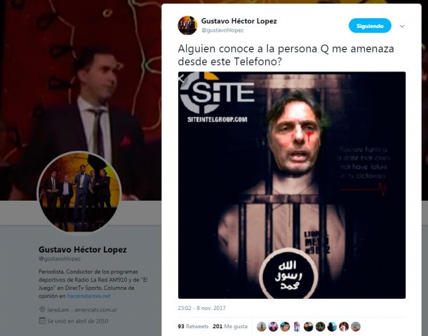 El periodista deportivo Gustavo López recibió una amenaza en su teléfono y decidió compartirla en su cuenta de Twitter. “¿Alguien conoce a la persona que me amenaza desde este teléfono?”, mencionó junto a una imagen en la que se ve su cara con un ojo ensangrentado.