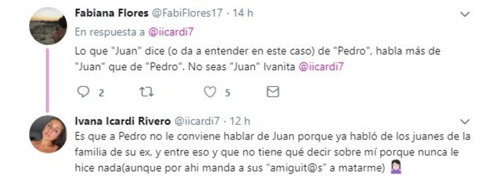 “Es que a Pedro no le conviene hablar de Juan porque ya habló de los juanes de la familia de su ex, y entre eso y que no tiene qué decir sobre mí porque nunca le hice nada (aunque por ahí manda a sus ‘amiguit@s’ a matarme)“, contestó la ex Gran Hermano.
