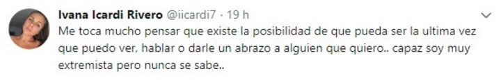 “Y no me quiero hacer la hija perfecta. Miles de veces me he enojado, o me he equivocado por inmadurez… pero sé de dónde vengo y quién es mi familia, los que han estado y estarán siempre… Me toca mucho pensar que existe la posibilidad de que pueda ser la ultima vez que puedo ver, hablar o darle un abrazo a alguien que quiero… capaz soy muy extremista pero nunca se sabe“, agregó con tristeza.