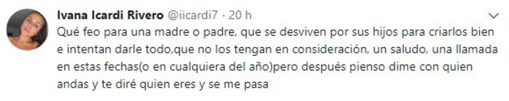 “Qué feo para una madre o padre, que se desviven por sus hijos para criarlos bien e intentan darle todo, que no los tengan en consideración, un saludo, una llamada en estas fechas (o en cualquiera del año) pero después pienso ‘dime con quién andas y te diré quién eres’ y se me pasa“, fue el primer y fulminante mensaje que escribió la hermana del futbolista este miércoles.