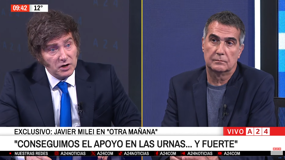 En otro pasaje de la entrevista con el periodista Antonio Laje, Milei admitió que no imaginó el resultado electoral que alcanzó el sello libertario, y destacó la campaña del diputado del PRO Diego Santilli. “La campaña de Santilli fue admirable”, resaltó y sostuvo que el legislador reelecto fue “uno de los primeros” que creyó en la alianza del PRO con La Libertad Avanza.