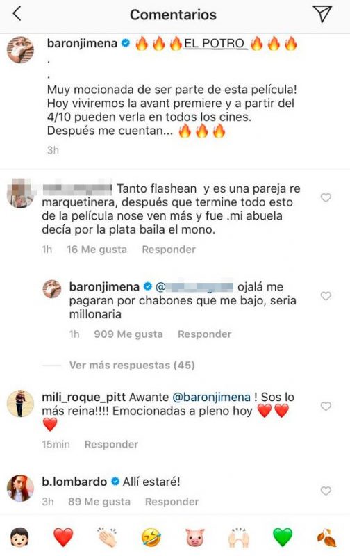 “Tanto flashean y es una pareja re marketinera. Después de que termine todo esto de la película no se ven más y fue. Mi abuela decía que por la plata baila el mono“, escribió la seguidora. Y Barón le respondió con contundencia e ironía: “Ojalá me pagaran por los chabones que me bajo, sería millonaria“.