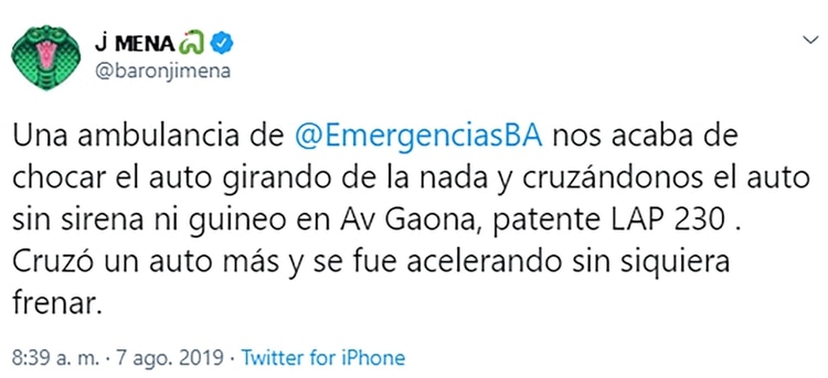 “Una ambulancia de @EmergenciasBA nos acaba de chocar el auto girando de la nada y cruzándonos el auto sin sirena, ni guiño en Av. Gaona, patente LAP 230. Cruzó un auto más y se fue acelerando sin siquiera frenar”, escribió en su cuenta de Twitter.