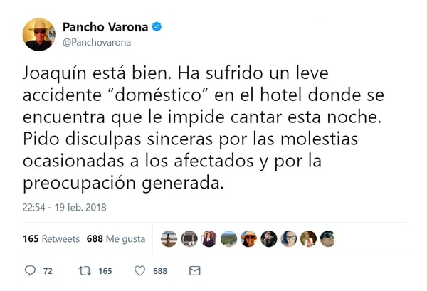 Pancho Verona, uno de sus músicos, habló de este episodio en su cuenta de Twitter:”Joaquín está bien. Ha sufrido un leve accidente ‘doméstico’ en el hotel donde se encuentra que le impide cantar esta noche. Pido disculpas sinceras por las molestias ocasionadas a los afectados y por la preocupación generada”.