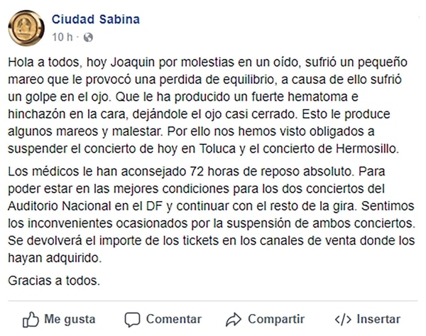 En Facebook, la producción de Sabina dio detalles del accidente: “Hola a todos, hoy Joaquín por molestias en un oído, sufrió un pequeño mareo que le provocó una perdida de equilibrio, a causa de ello sufrió un golpe en el ojo. Que le ha producido un fuerte hematoma e hinchazón en la cara, dejándole el ojo casi cerrado. Esto le produce algunos mareos y malestar. Por ello nos hemos visto obligados a suspender el concierto de hoy en Toluca y el concierto de Hermosillo. Los médicos le han aconsejado 72 horas de reposo absoluto. Para poder estar en las mejores condiciones para los dos conciertos del Auditorio Nacional en el DF y continuar con el resto de la gira…”.