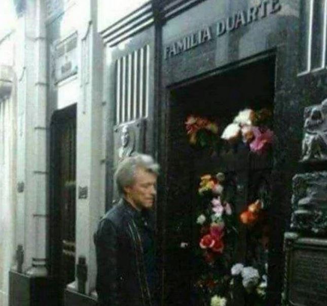 Jon Bon Jovi decidió hacer un poco de turismo por la ciudad de Buenos Aires. Visitó el Cementerio de Recoleta y circuló una foto en las redes sociales del cantante en el mausoleo de la familia Duarte, en el que se encuentran los restos de Evita.