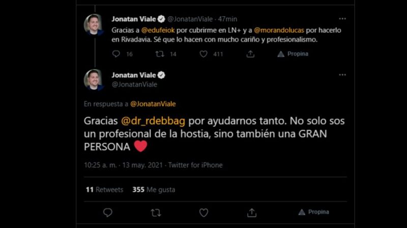 “Gracias a @edufeiok por cubrirme en LN+ y a @morandolucas (Lucas Morando) por hacerlo en Rivadavia. Sé que lo hacen con mucho cariño y profesionalismo”, aseguró el periodista que presenta los ciclos + Realidad y Pan y Circo en esas respectivas emisoras.