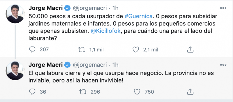Ante esta medida, Jorge Macri escribió en su cuenta de twitter: “50.000 pesos a cada usurpador de Guernica. 0 pesos para subsidiar jardines maternales e infantes. 0 pesos para los pequeños comercios que apenas subsisten. Axel Kicillof, para cuándo una para el lado del laburante?”.