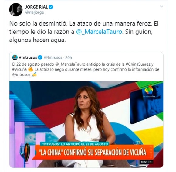 Al ver el tweet de Intrusos sobre la confirmación de la ruptura, Jorge Rial (que se encuentra haciendo reposo tras su operación de vesícula) respondió defendiendo a Tauro y criticando a la China: “No solo la desmintió. La atacó de una manera feroz. El tiempo le dio la razón a @_MarcelaTauro. Sin guión, algunos hacen agua”.