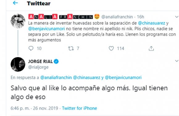 Luego al ver un tweet de Analía Franchín sobre una de las teorías de la separación, que decía “La manera de inventar huevadas sobre la separación de @chinasuarez y @benjavicunamori no tiene nombre ni apellido ni nik. Please chicos, nadie se separa por un like. Solo un pelotudo/a haría eso. Llenen los programas con más argumentos”; Rial disparó: “Salvo que al like lo acompañe algo más. Igual tienen algo de eso”.