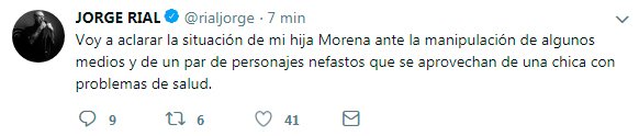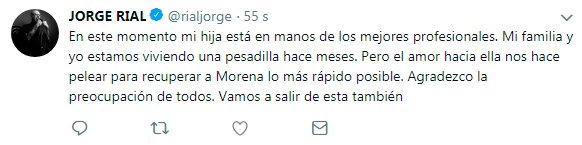 “Voy a aclarar la situación de mi hija Morena ante la manipulación de algunos medios y de un par de personajes nefastos que se aprovechan de una chica con problemas de salud”, tuiteó Jorge Rial esta mañana luego de que se conociera un audio de la joven en el que denuncia haber sido drogada y trasladada desde el sanatorio donde estaba internada a una clínica psiquiátrica.
