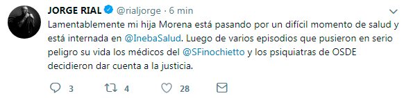 Al respecto, Rial expresó que “lamentablemente mi hija Morena está pasando por un difícil momento de salud y está internada en Ineba –tal como informaba el audio-. Luego de varios episodios que pusieron en serio peligro su vida, los médicos del Finochietto y los psiquiatras de OSDE decidieron dar cuenta a la justicia”.
