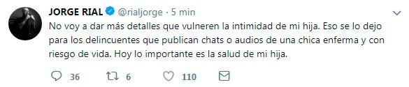 Por otro lado, Rial apuntó directamente contra Ulises y Natacha Jaitt, luego de que el hermano de la conductora difundiera el audio en el que Morena informa que está internada y pide ayuda: No voy a dar más detalles que vulneren la intimidad de mi hija. Eso se lo dejo para los delincuentes que publican chats o audios de una chica enferma y con riesgo de vida”, lanzó Jorge y finalizó: “Hoy lo importante es la salud de mi hija”.