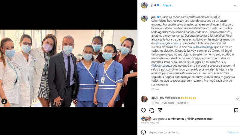 En un reciente posteo en su cuenta de Instagram, el conductor agradeció a los profesionales que lo atendieron en esa institución: “Gracias a todos estos profesionales de la salud colombiana, hoy les estoy escribiendo después de un susto enorme. Por suerte estos ángeles estaban en el lugar indicado e hicieron todo lo posible para mantenerme con vida. Agradezco la sensibilidad de cada uno. Fueron cariñosos , amables y muy humanos”.