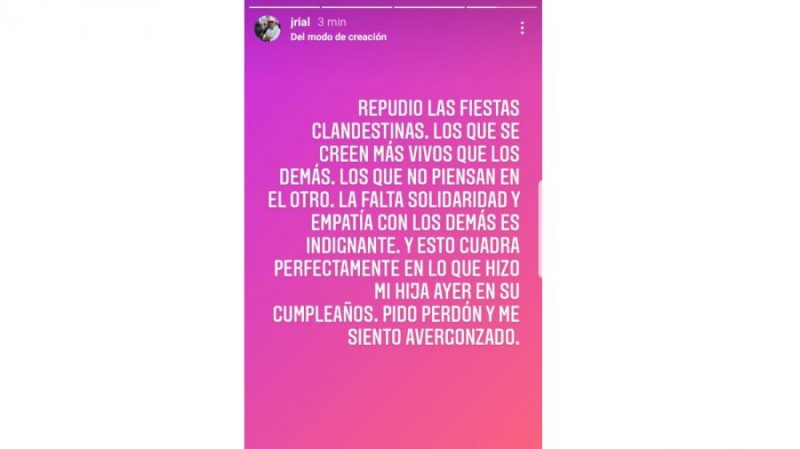Repudio las fiestas clandestinas”, comenzó el descargo en la storie del ex conductor de Intrusos en el espectáculo, y continuó: “Los que se creen más vivos que los demás. Los que no piensan en el otro. La falta de solidaridad y empatía con los demás es indignante. Y esto cuadra perfectamente en lo que hizo mi hija ayer en su cumpleaños”.