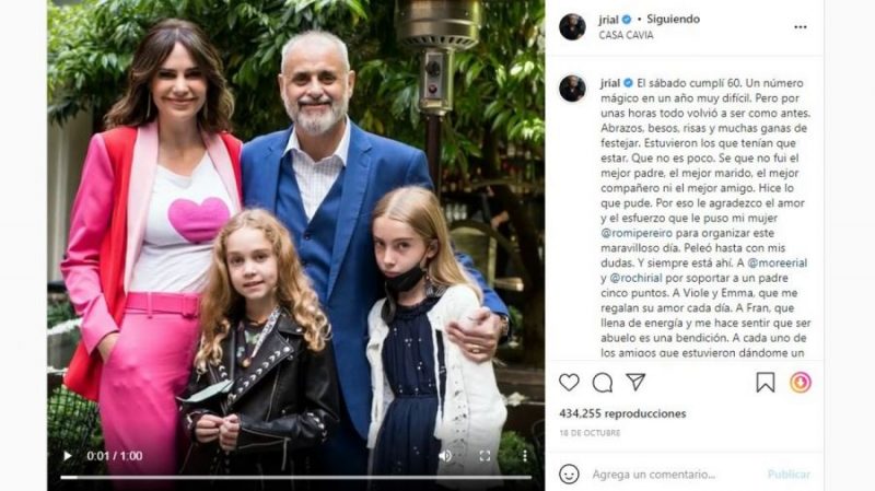 El pasado 18 de octubre, Jorge Rial publicó en su cuenta de Instagram un video que lo muestra con Romina Pereiro, las hijas de ella, Morena, Rocío, sus hijas, y su nieto, Francesco, y escribió junto a la grabación: “El sábado cumplí 60. Un número mágico en un año muy difícil. Pero por unas horas todo volvió a ser como antes. Abrazos, besos, risas y muchas ganas de festejar. Estuvieron los que tenían que estar. Que no es poco. Se que no fui el mejor padre, el mejor marido, el mejor compañero ni el mejor amigo. Hice lo que pude. Por eso le agradezco el amor y el esfuerzo que le puso mi mujer @romipereiro para organizar este maravilloso día. Peleó hasta con mis dudas. Y siempre está ahí“.