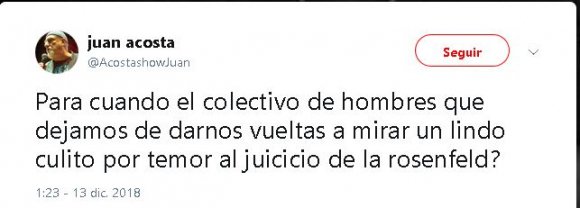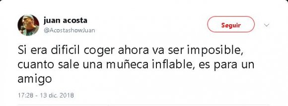 Un nuevo exabrupto puso a Juan Acosta en la palestra, cuando pretendió hacer humor con las eventuales consecuencias para los hombres de las oleadas de denuncias de abuso sexual por parte de algunas mujeres. A través de Twitter, el jueves por la tarde el actor lanzó su repudiable chiste: “Si era difícil cog…, ahora va ser imposible ¿Cuánto sale una muñeca inflable? Es para un amigo”.