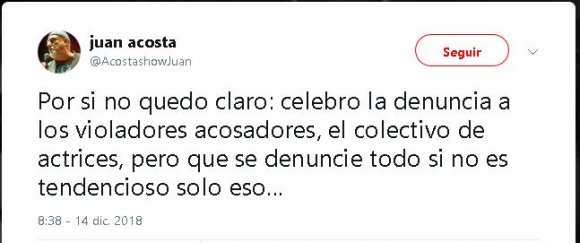 En la mañana del viernes, Juan Acosta se retractó a su modo: “Por si no quedó claro, yo celebro la denuncia a los violadores y acosadores, y al colectivo de actrices. Pero que se denuncie todo, sino es tendencioso. Solo eso…”