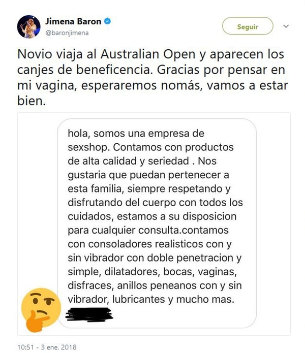 “Novio viaja al Australian Open y aparecen los canjes de beneficencia. Gracias por pensar en mi vagina, esperaremos nomás, vamos a estar bien”, comentó, junto a la propuesta de la empresa.