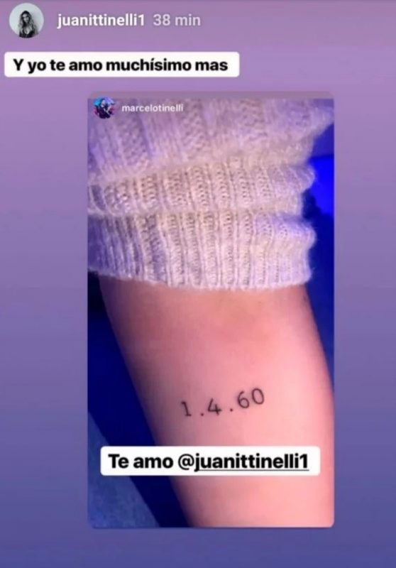 1.4.60 se grabó con tinta negra en el antebrazo. Dichos números son la fecha en la que nació Tinelli. Al ver el posteo de Juanita, Marcelo no tardó en compartirlo en su red, con un “te amo, Juanita“. Al ver la mención, ella le contestó: “Y yo te amo muchísimo más“.