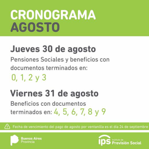 El Instituto de Previsión Social (IPS), informa que los jubilados y pensionados de la Provincia de Buenos Aires percibirán los haberes del mes de agosto entre el jueves 30 y el viernes 31 del corriente, según cronograma que se detalla a continuación: