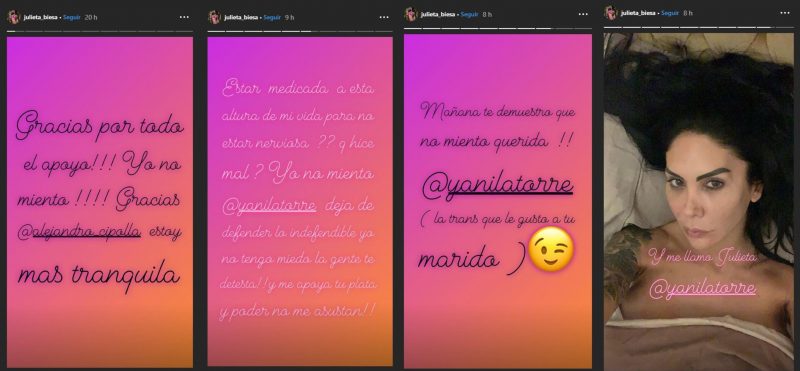 La palabra de la vedette no tardó en llegar. “¿Estar medicada a esta altura de mi vida para no estar nerviosa? ¿Qué hice mal? Yo no miento Yanina Latorre, dejá de defender lo indefendible. Ya no tengo miedo, la gente te detesta y me apoya. La plata y tu poder no me asustan“, escribió.
