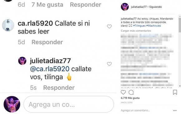 Lejos de hacer oídos sordos, Julieta no sólo responde a sus detractores, sino que lo hace de forma muy filosa e incluso comparte las capturas de pantalla.