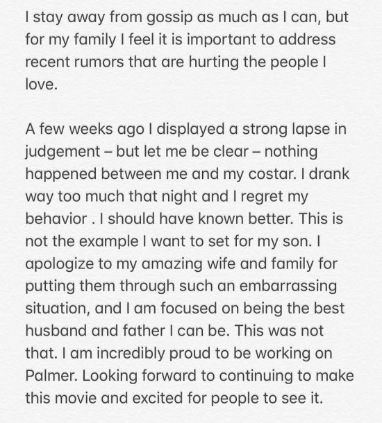 Hace unas semanas mostré un fuerte lapso en el juicio, pero que quede claro: no pasó nada entre mi coprotagonista y yo. Bebí demasiado esa noche y lamento mi comportamiento. Debería haberlo sabido”, reconoció Justin.